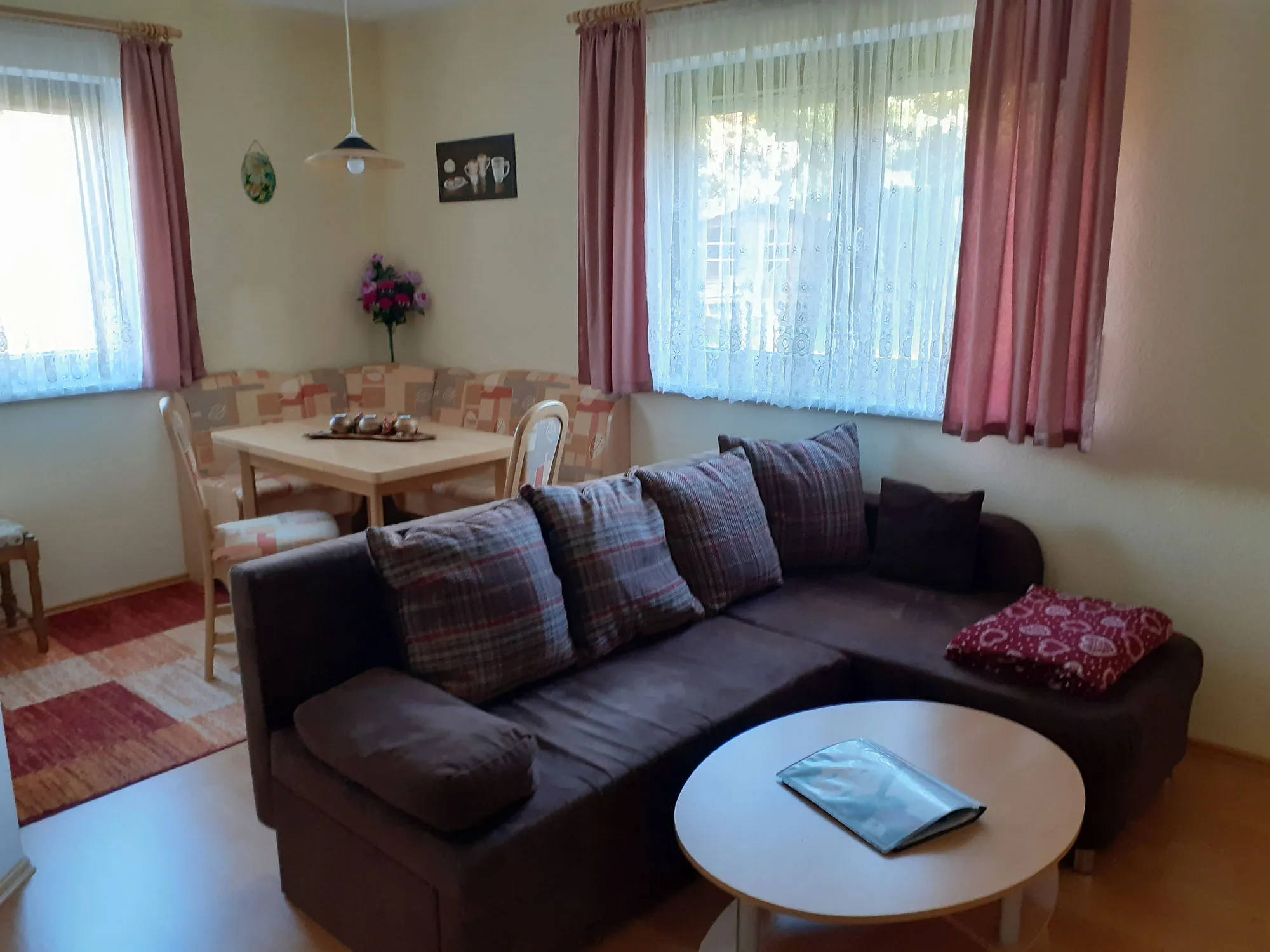 Sie wohnen in ruhiger Lage mitten im Ort in der Einliegerwohnung unseres Einfamilienhauses. Die Ferienwohnung ist für 2 Personen geeignet, Aufbettung ist auf Wunsch möglich. Sie hat eine Wohnfläche von ca. 41 m². Sie verfügt über einen separaten Eingang. Die Küche ist vollständig eingerichtet. Mikrowelle, Toaster, Kaffeemaschine sowie Kühlschrank mit Gefrierfach sind vorhanden. WLAN ist verfügbar.